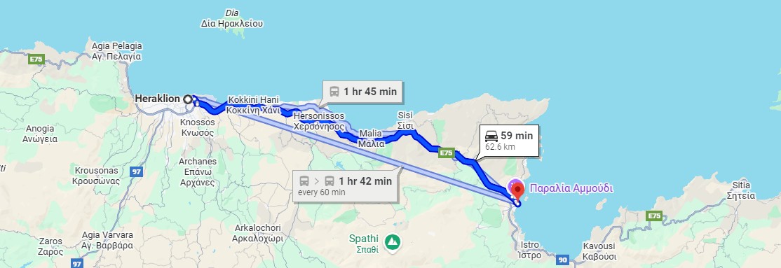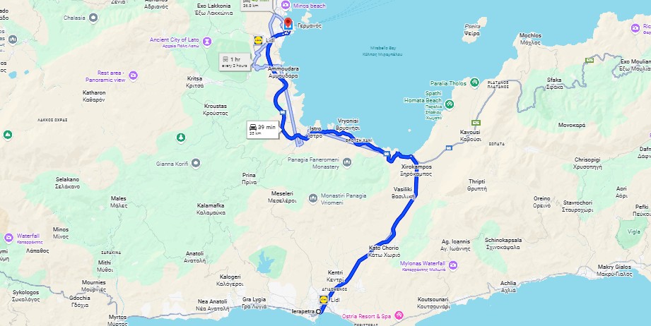To get from Ierapetra to Agios Nikolaos, the distance is around 35 km, with the drive taking 45 minutes via the inland route or about 1 hour if you choose the more scenic coastal road through Pachia Ammos. With your own vehicle, you can enjoy flexible timing and the chance to stop at small villages or beaches along the way.